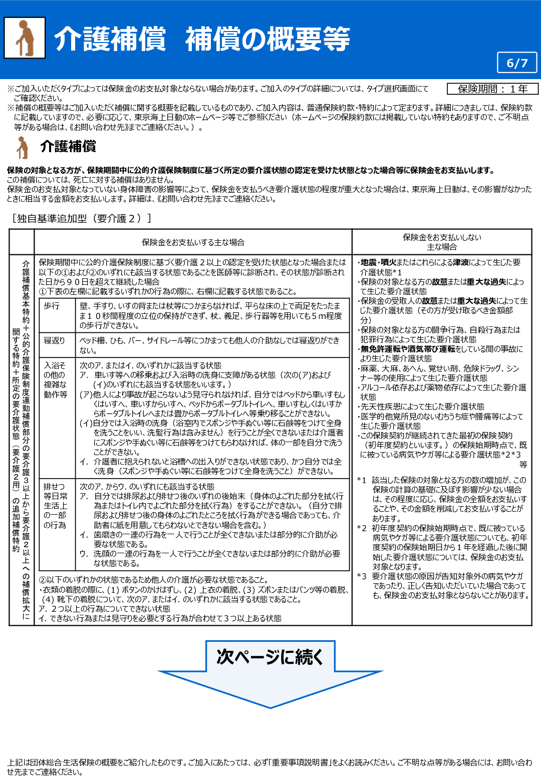 - 東京海上日動所定の要介護状態(要介護2用)*1と診断され、その状態が90日を超えて継続した場合